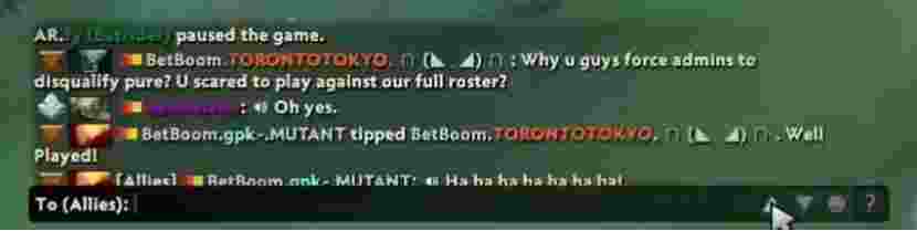 事情的起因是在巴厘岛major,BB战队在胜者组2:0战胜Tundra后,队内的三号位pure被tundra战队举报比赛暂停期间看当场比赛的直播,按照比赛规则被判负,这就让原本准备好和Tundra对阵的AR措手不及。这之后BB战队却不要脸地找主办方关系和AR沟通,让pure在被禁赛的情况下单独参加他们和AR的对战。AR自然是不会同意的,于是就有了前雪碧中单,现任BB五号位的多伦多东京在巴厘岛比赛时的公屏嘲讽。