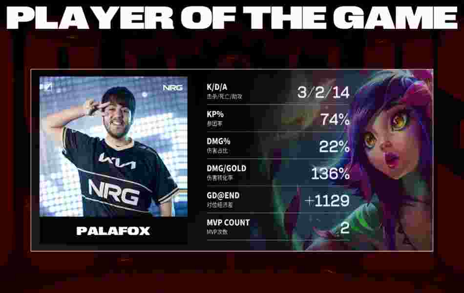 第30分钟,NRG众人上路推进,尼蔻大招开到四人,NRG坐拥1w经济优势打成0换3后一波结束了比赛。