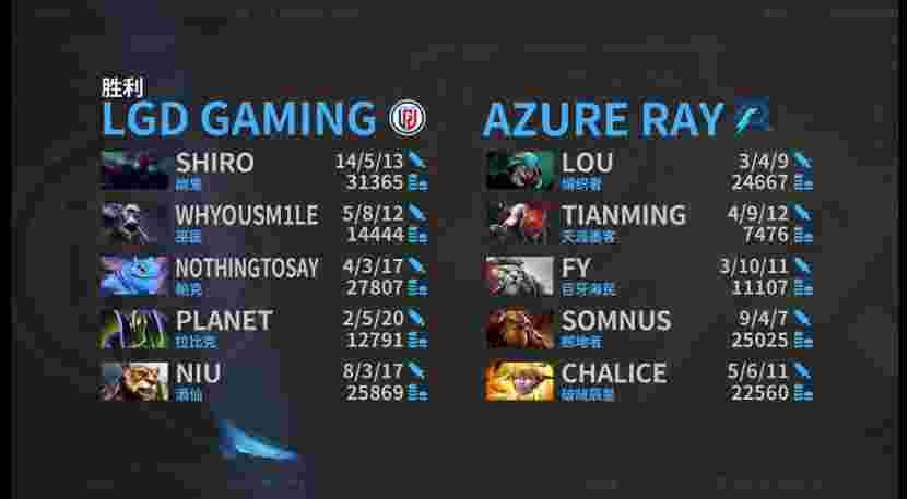 AR天辉,LGD夜魇。上路chalice的钢背兽和fy的毒狗对阵shiro的琼英碧灵和y队的复仇之魂,中路maybe的电炎绝手对阵nothingtosay的猛犸,下路lou的蚂蚁和天命的发条对阵niu的夜魔和邪影芳灵。