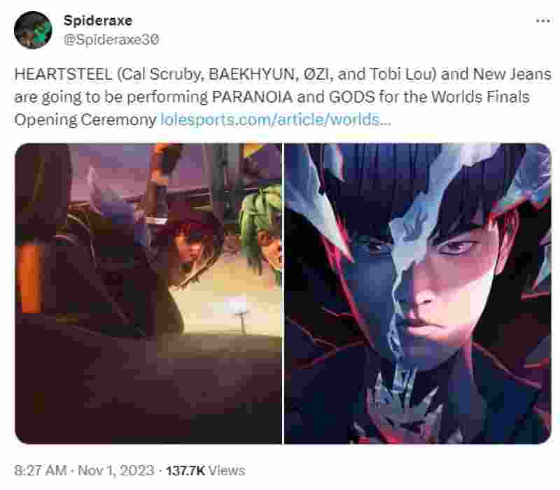 据联盟Wiki更新者Spideraxe推特爆料,心之钢乐队(边伯贤、ØZI、Tobi Lou、Cal Scruby)和Newjeans会登上这次S13世界赛决赛的开幕式舞台,为现场的观众带来PARANOIA和GODS这两首歌的表演。