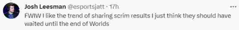 “无论如何,我喜欢这种分享训练赛结果的趋势,但是我觉得他们应该等到全球总决赛结束再发。”
