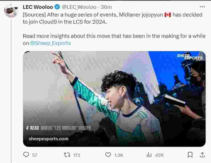 LEC Wooloo:“据消息源透露,在经过一系列巨大的事件之后,来自加拿大的中单选手jojopyun决定加入LCS赛区的C9战队征战2024赛季。”