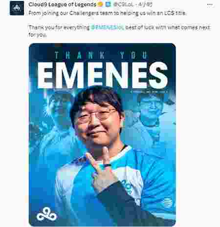 11月08日,C9发文告别中单选手EMENES:从加入青训到帮助我们赢得LCS冠军!感谢你一路以来的付出,希望你接下来一切顺利!