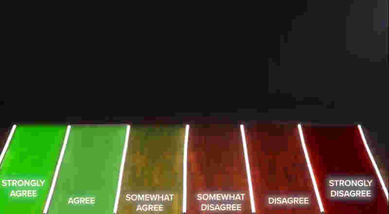 我们看到,三位选手选择了绝对同意,两名选手选择了同意,一位选手选择了有点同意。