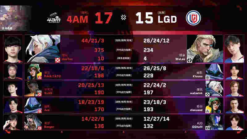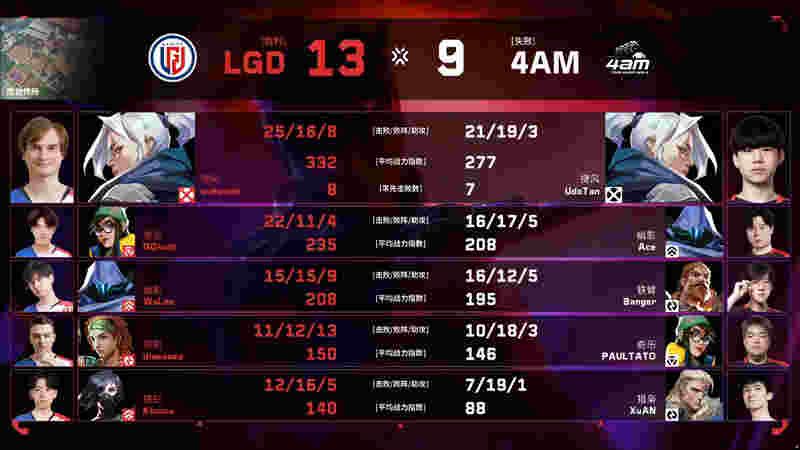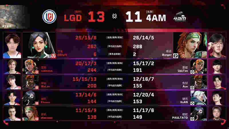 下半场攻守交换,4AM赢下手枪局后凭借队员的技能配合与快速进点不断得分,将比分差距不断缩小并追至8:8平,Banger的一波五杀,更是成功打出了队伍的气势。双方在之后战入僵持,第23分,GGhuiii一波三杀率先帮LGD拿到赛点,最终有惊无险赢下比赛。