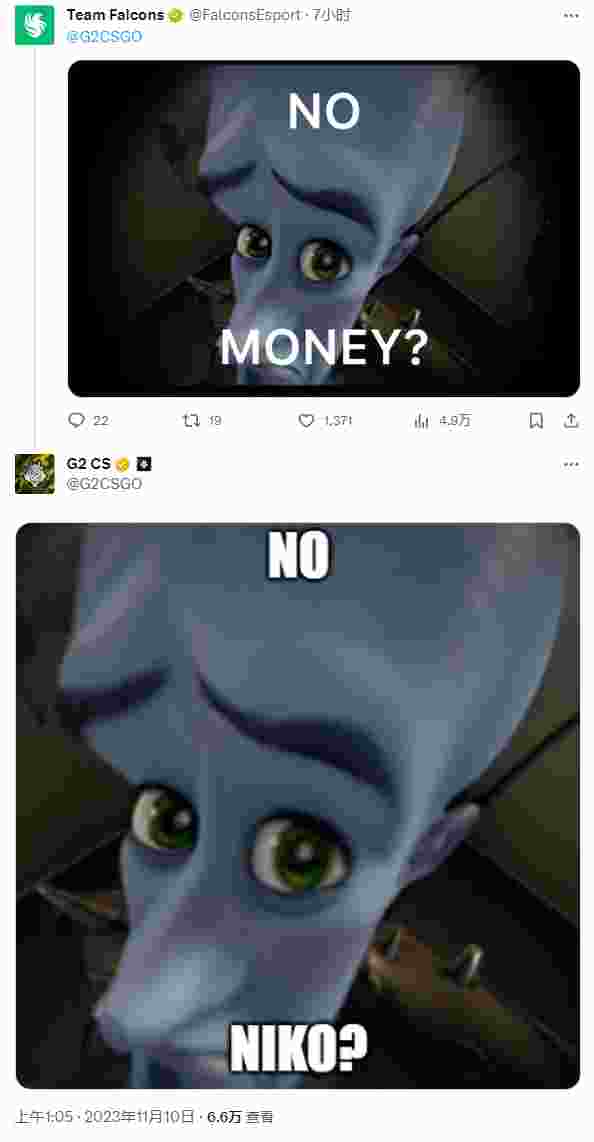 Justin Savage | jks的消息再次引爆社区,而在HLTV这条推特消息的评论区中,Falcons艾特了G2CSGO,并且发了一张图片:没钱了?