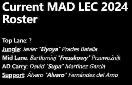 11月10日,据外媒Sheep Esports报道,消息人士向他们透露LEC战队MAD Lions将签下今年欧洲大师赛亚军,西班牙联赛战队Movistar Riders的中单选手Fresskowy。这也将是MAD继主教练、AD、辅助之后签下的第四名来自西班牙MRS战队的成员。而根据Sheep Esports报道,MAD打野、西班牙人Elyoya已经决定和队伍续约。 除上单位置尚未确定外,MAD在2024年的阵容已经基本确定。其中除西班牙打野Elyoya外中下三人和主教练均来自西班牙战队MRS。