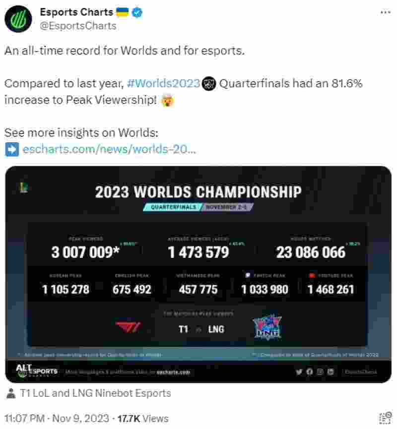 外媒数据网站EsportsCharts发布推特,2023年全球总决赛四分之一决赛观赛人数峰值达到3007009,相较去年增长81.6%。