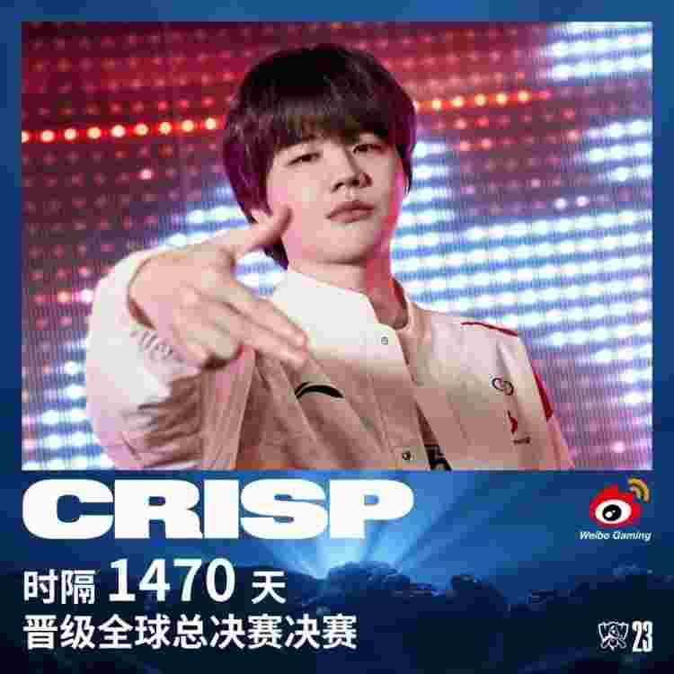 2023英雄联盟全球总决赛半决赛WBG战胜BLG后,Crisp时隔1470天晋级全球总决赛决赛,上一次是在2019年11月2日FPX 3:1 战胜IG后晋级全球总决赛决赛。