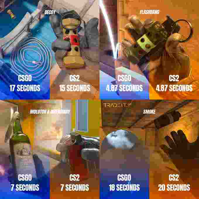 日前外媒统计了CSGO与CS新版本中投掷物的数据变化。CS新版本中诱饵弹的时间从17秒缩短到了15秒,烟雾弹的时间从18秒延长到了20秒。