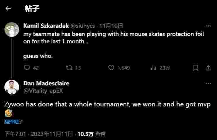 Kamil Szkaradek | siuhy在个人推特上分享了关于队友的趣事。他的某位队友一个月以来一直没撕鼠标脚贴膜。