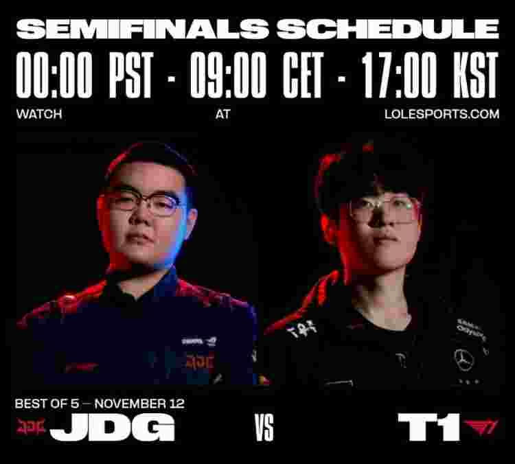 2023英雄联盟全球总决赛半决赛JDG vs T1(BO5)的比赛将于11月12日16点开赛。LOL官推发布海报——上路369和Zeus的对决
