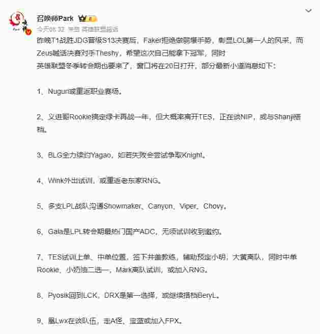 英雄联盟冬季转会期也要来了,窗口将在20日打开,根据博主召唤师Park的微博来看,部分最新小道消息如下: