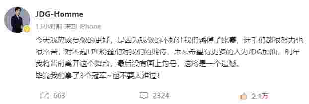 “今天我应该要做的更好,是因为我做的不好让我们输掉了比赛,选手们都很努力也很辛苦,对不起LPL粉丝们对我们的期待,未来希望有更多的人为JDG加油,明年我将暂时离开这个舞台,最后没有画上句号,这将是一个遗憾。毕竟我们拿了3个冠军~也不要太难过!”