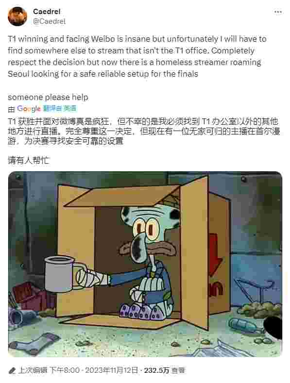 近日LEC解说、TheShy铁粉——欧刚Caedrel更新推特,表示自己因为支持WBG夺冠,被T1的工作人员赶出了办公室,因此目前正在韩国流浪没法直播,求网友收留。