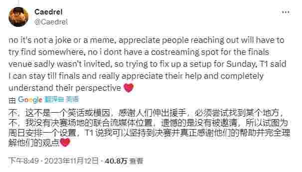 但不少网友不相信Caedrel的言论,怀疑他是在整活。结果Caedrel再次发文表示:这不是一个笑话或者梗,因为自己没有被拳头官方邀请到二路,所以自己必须在决赛前找个地方直播,T1官方说可以收留自己到决赛前,自己完全理解他们的立场。