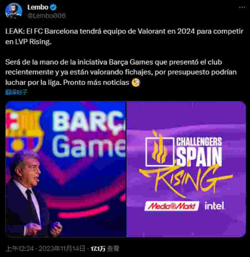 “巴塞罗那足球俱乐部将于2024 年拥有一支 Valorant 战队,并且参加 LVP Rising的比赛。