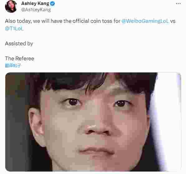 今日韩媒记者Ashley Kang在推特更新动态,表示蜻蜓队长将(协助)WBGvsT1的红蓝方选边—抛硬币环节!