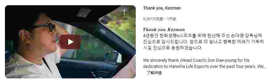 “在运营队伍的过程中,感觉会有所成就,会达到自己想要的目标,但是最终没能实现这个过程。本想将队伍、粉丝和选手团结在一起,展现出优秀的团队,但今年没能做到。从LCK最下游到晋级世界赛的所有瞬间都记忆犹新,感谢一起做到这些的队员和教练们。和之前一样有着举起世界赛冠军奖杯的野心,想亲自带队,继续做监督的工作。”