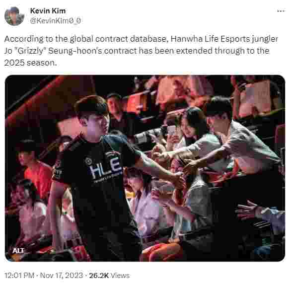 11月17日有韩媒记者透露,根据全球选手合同数据库的数据,LCK赛区HLE战队打野Grizzly的合同结束时间为2025赛季。