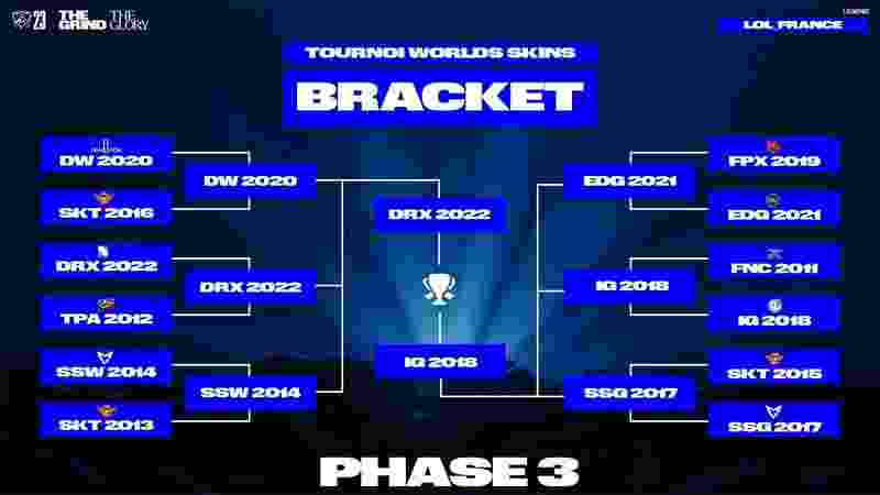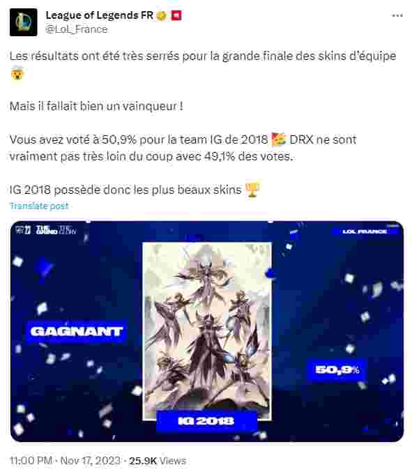 11月17日晚,LOL法语官方推特发起的世界冠军皮肤争霸赛中,2018年的IG冠军皮肤以50.9%的得票率战胜2022年的DRX冠军皮肤,荣获最美冠军皮肤称号!