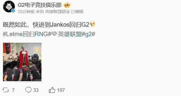 今日RNG官宣了Letme的回归,G2电子竞技俱乐部官博发布图片整活,并配文道:“既然如此,快进到Jankos回归G2。”