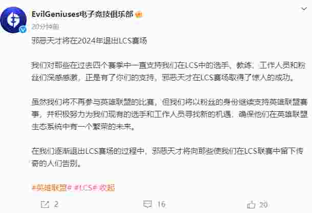 11月21日,EvilGeniuses电子竞技俱乐官博更新,发文告别英雄联盟赛场,原文如下: