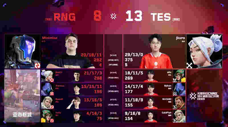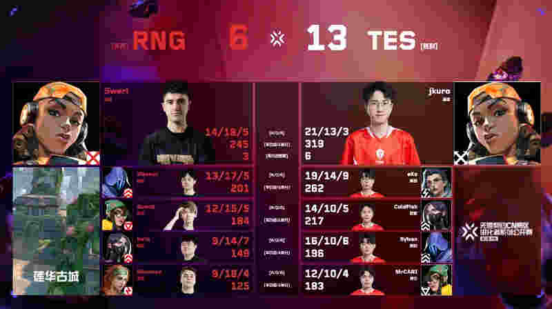 下半场攻守转换,GuanG一波三杀帮助RNG赢下手枪局并利用经济优势将比分追平。但下回合开始jkuro持续发力,接连斩获数次多杀再次将比分拉开。第二十回合,jkuro再次展现个人能力残局收获三杀帮助TES率先拿到赛点,最后也是一鼓作气赢下了比赛。