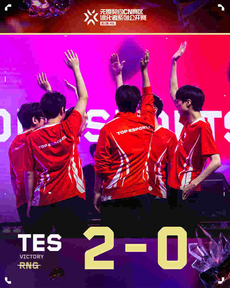 CN进化者公开赛第三幕正赛阶段,败者组第一轮,TES直落两盘淘汰RNG,晋级下一轮。