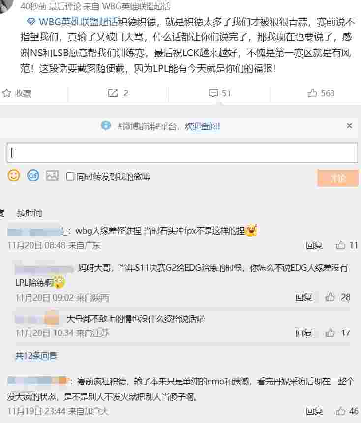 11月19日,S13全球总决赛WBG被T1横扫,赛后WBG超话暂开热议,怒斥赛区粉。
