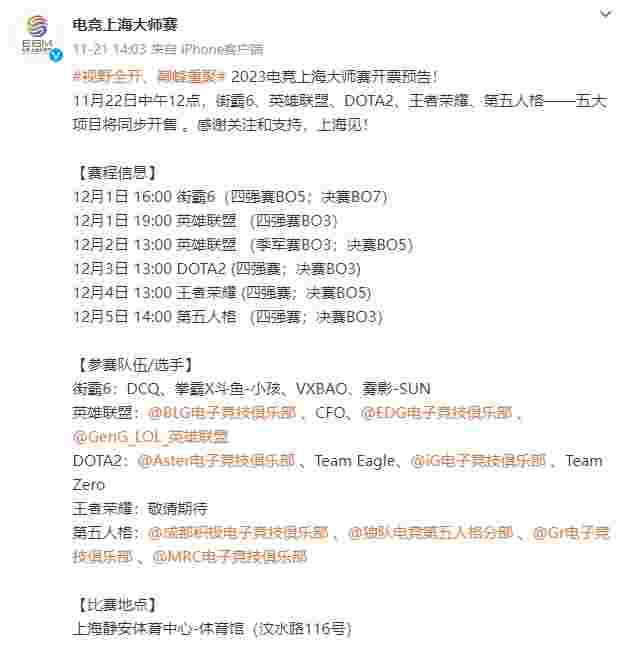 2023电竞上海大师赛将于2023年12月1日正式开赛,英雄联盟项目邀请了EDG、BLG、CFO(PCS)以及GEN(LCK)四支队伍,12月1日进行四强赛,次日进行季军赛和决赛。门票已于11月22日中午12点开售。