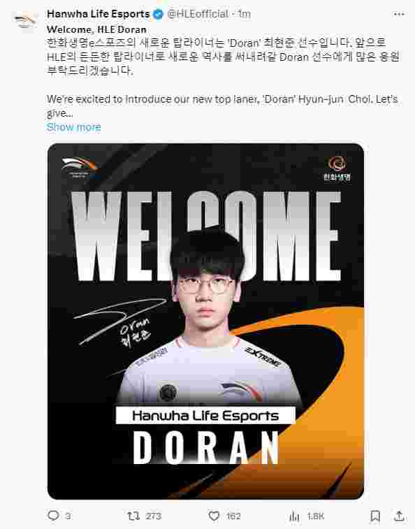 11月24日下午,HLE战队官方推特宣布,原GEN上单选手Doran加入队伍,征战LCK2024赛季。