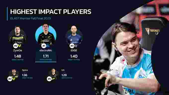 本次BLAST Premier秋季决赛,electroNic的发挥让人眼前一亮。如今HLTV公布了该赛事到目前为止Impact Rating前五的选手,其中electroNic以1.71的Impact Rating位列第一。