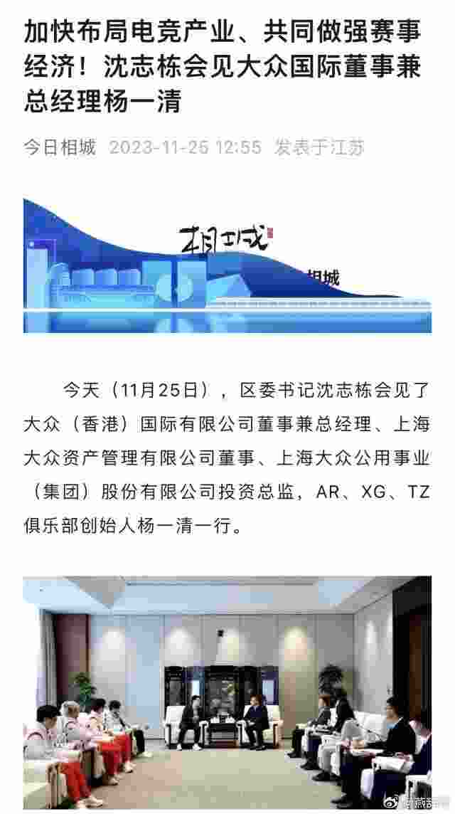 11月25日,区委书记沈志栋会见了大众(香港)国际有限公司董事兼总经理、上海大众资产管理有限公司董事、上海大众公用事业(集团)股份有限公司投资总监,AR、XG、TZ俱乐部创始人杨一清一行。