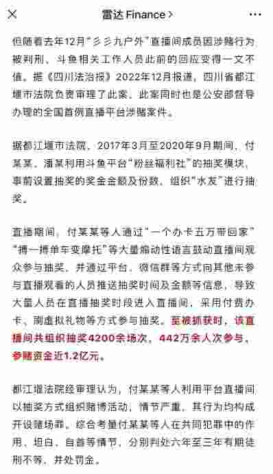 日前成都公安发出公告:斗鱼CEO陈少杰涉嫌开设赌场罪依法被捕,引发舆论风暴。斗鱼直播平台曾经就有主播利用抽奖模块来进行赌博活动,被公安机关抓获后判刑。