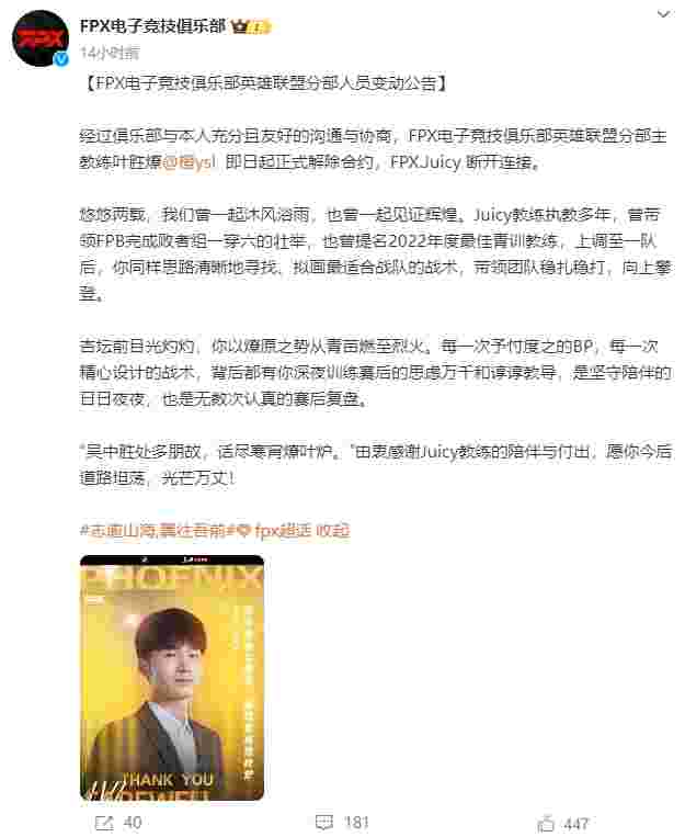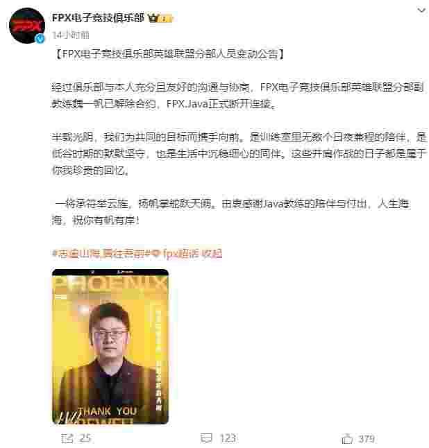 11月27日晚,FPX战队官宣队内主教练Juicy和副教练Java离队。
