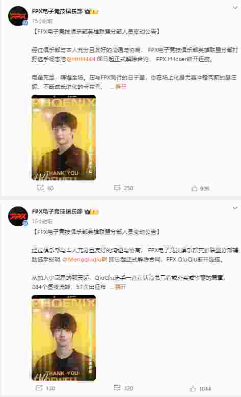 FPX近日发布人员变动公告,打野选手H4cker、辅助选手QiuQiu即日起正式解除合约, FPX.H4cker断开连接、FPX.QiuQiu断开连接。