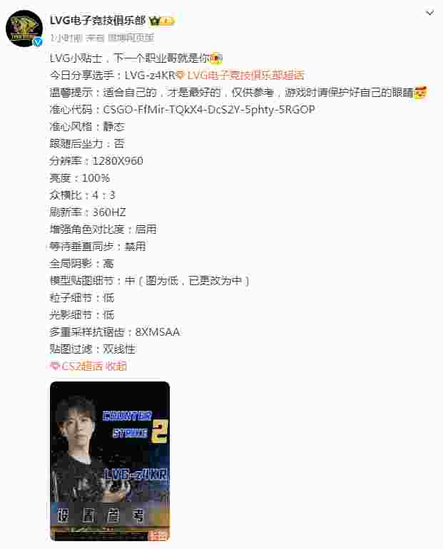 Lynn Vision电子竞技俱乐部在微博上分享小贴士,给大家公布了队内职业哥z4kr的职业设置。三叶在最近三个月的比赛中平均Rating达到1.03,拥有0.67的场均击杀以及61%的爆头率,大家可以参考一下他的新版本设置。