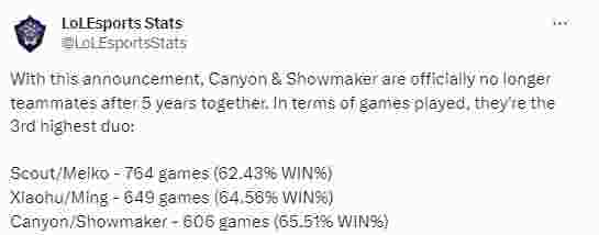 近日Canyon官宣加盟GEN,这也代表他正式结束了和Showmaker的五年队友生涯。事后LOL赛事数据官推发文,就比赛搭档场次而言,他们说英雄联盟历史上搭档次数第三的双人组,前三分别是: