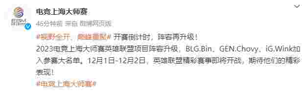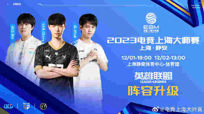 11月30日下午,电竞上海大师赛官博宣布,在开赛前一天赛事迎来阵容升级,BLG.Bin、GEN.Chovy和IG.Wink加入大名单。