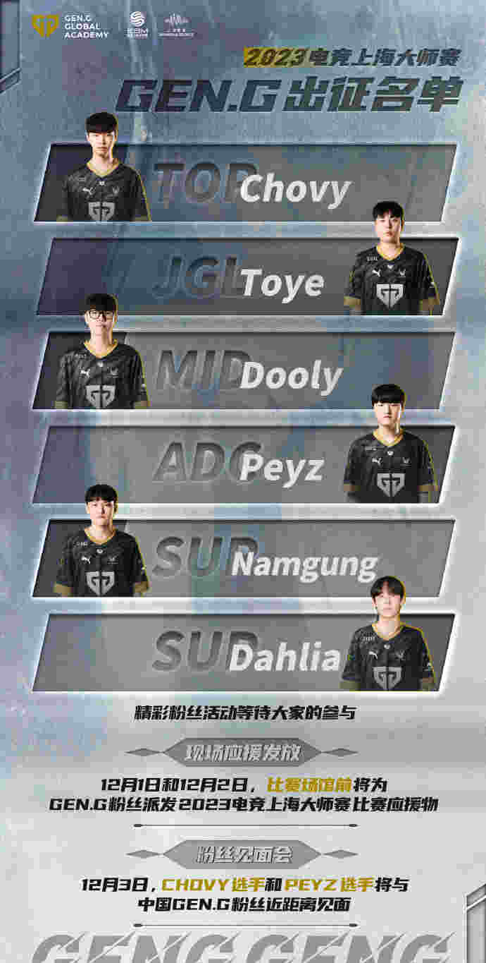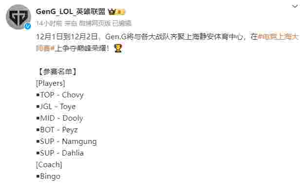 11月29日晚讯,之后要参加电竞上海大师赛的GEN战队在微博官宣了阵容,除了Peyz外其他都是二队选手,但是本来是TBD的位置居然出现了Chovy的名字,而且司职位置是上单,又要搞科研了?