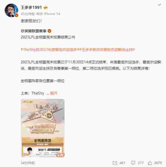 11月30日,2023LPL全明星周末投票结果公布,王多多斩获年度最受欢迎解说!