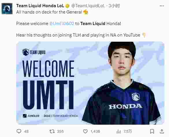 11月30日,北美TL战队今晨官宣,上赛季效力于韩国BRO战队的打野选手UmTi将加盟TL战队。