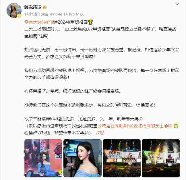 12.2日,解说诗诗微博发文:很荣幸能陪伴k甲经历更多 又一年,明年春天再会;原文如下: