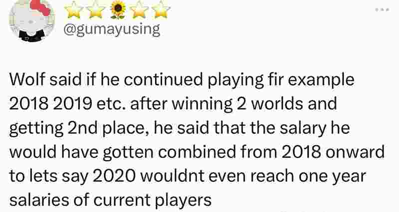 近日前SKT传奇辅助选手——Wolf在直播中谈到,如果他在获得两个世界冠军和一个亚军之后,2018、2019年继续职业生涯,从2018年到2020年的薪资加起来都不会有现在选手一年的薪资水平。