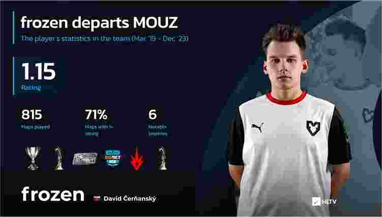 根据统计,frozen在为MOUZ效力的1722天中,共为MOUZ征战了815张地图,在其中71%的地图上都能拿到超过1.0的Rating,平均rating达到1.15,同时他还帮助队伍在六项顶级赛事中夺冠。除此之外,他还获得过一届赛事的MVP奖杯,并在2022年首次入选HLTV TOP选手之列,排名第17。