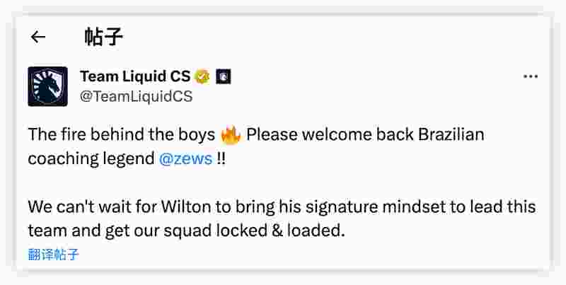 Liquid战队宣布签下zews作为战队主教练,后者将会填补