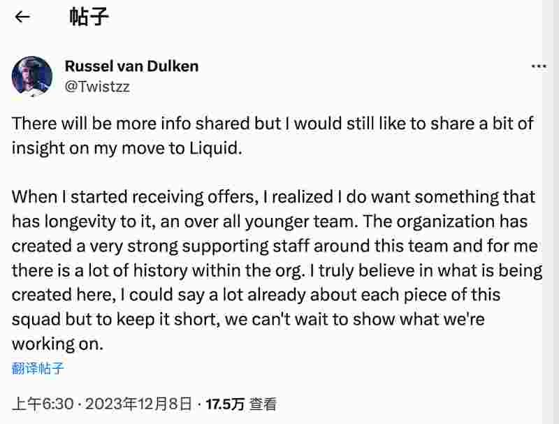 Russel Van Dulken | Twistzz:虽然在之后会分享更多信息,但现在我想谈谈加入Liquid的个人视角。