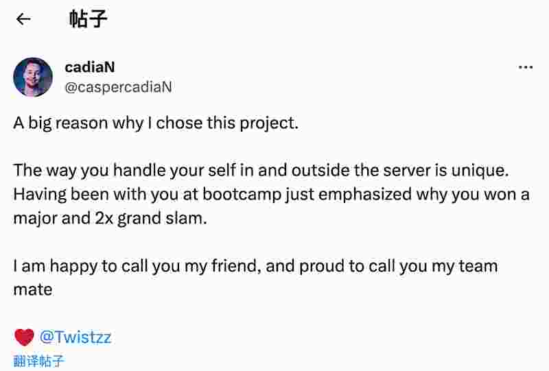 Casper Møller | cadiaN:你(Twistzz)是我选择加入Liquid的重要原因。你在游戏内外的自我管理非常特别。和你一起参加集训更让人明白你为何可以赢下Major和两届大满贯。