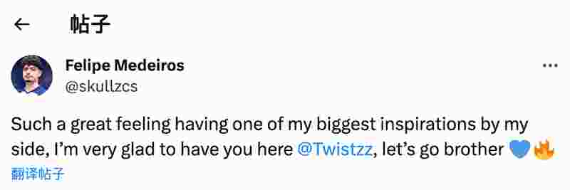 Felipe Medeiros | skullz:我最大的精神支柱之一如今就在身边,这种感觉太棒了。我很高兴能有你作为队友,一起冲冲冲!